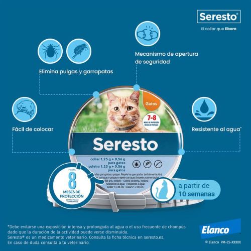 El collar antiparasitario Seresto gatos desarrollado por la marca Elanco (anteriormente Bayer) es un antiparasitario externo que protege a nuestra mascota de garrapatas, pulgas y piojos durante 8 meses. Molestos parásitos que pueden causar problemas en nuestras mascotas y en nosotros mismos.