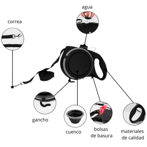 - Bol de Silicona Plegable para Descanso y Alimentación: Incluye un bol de silicona plegable, ideal para ofrecerle a tu mascota un rápido y cómodo descanso para beber agua o disfrutar de un snack durante el paseo.
